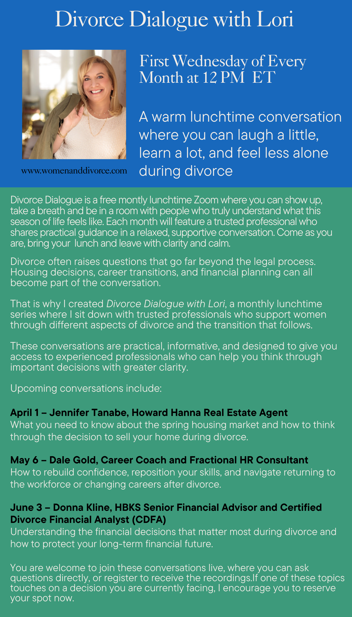 After 25 years as a stay-at-home mom supporting my husband and his career, I was completely blindsided by divorce. My world turned upside down overnight—and like so many women in this situation, I felt angry, hurt, confused, and unprepared for the road ahead. I worried about everything: my finances, my future, and most of all, how to support my children emotionally when I was struggling myself. I made mistakes—hard, painful mistakes—but I also learned powerful lessons along the way. Today, as the founder of WomenAndDivorce.com and a Certified Divorce Coach, it’s my mission to help women like you navigate this overwhelming season with strength and clarity. I specialize in supporting women who’ve been betrayed and blindsided, helping them move past the turmoil and financial insecurity so they can reclaim their confidence, peace, and stability. In addition to my private and group coaching programs, I’ve created two practical guides to support women during this time: The 6 Most Common Mistakes Women Make in Divorce—And How to Avoid Them and Holiday Survival Tips for Families Experiencing Divorce. You don’t have to do this alone. I’ll help you quiet the emotional chaos, make clear decisions without regrets, and find the strong, confident voice you’ll need to advocate for yourself—because the choices you make now will shape the rest of your life.